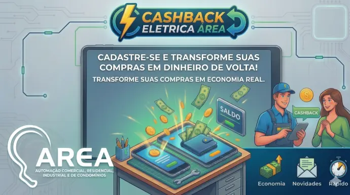 Na Elétrica Area, o seu projeto vale mais. Cada compra garante Cashback exclusivo para você utilizar em sua próxima manutenção ou reforma.